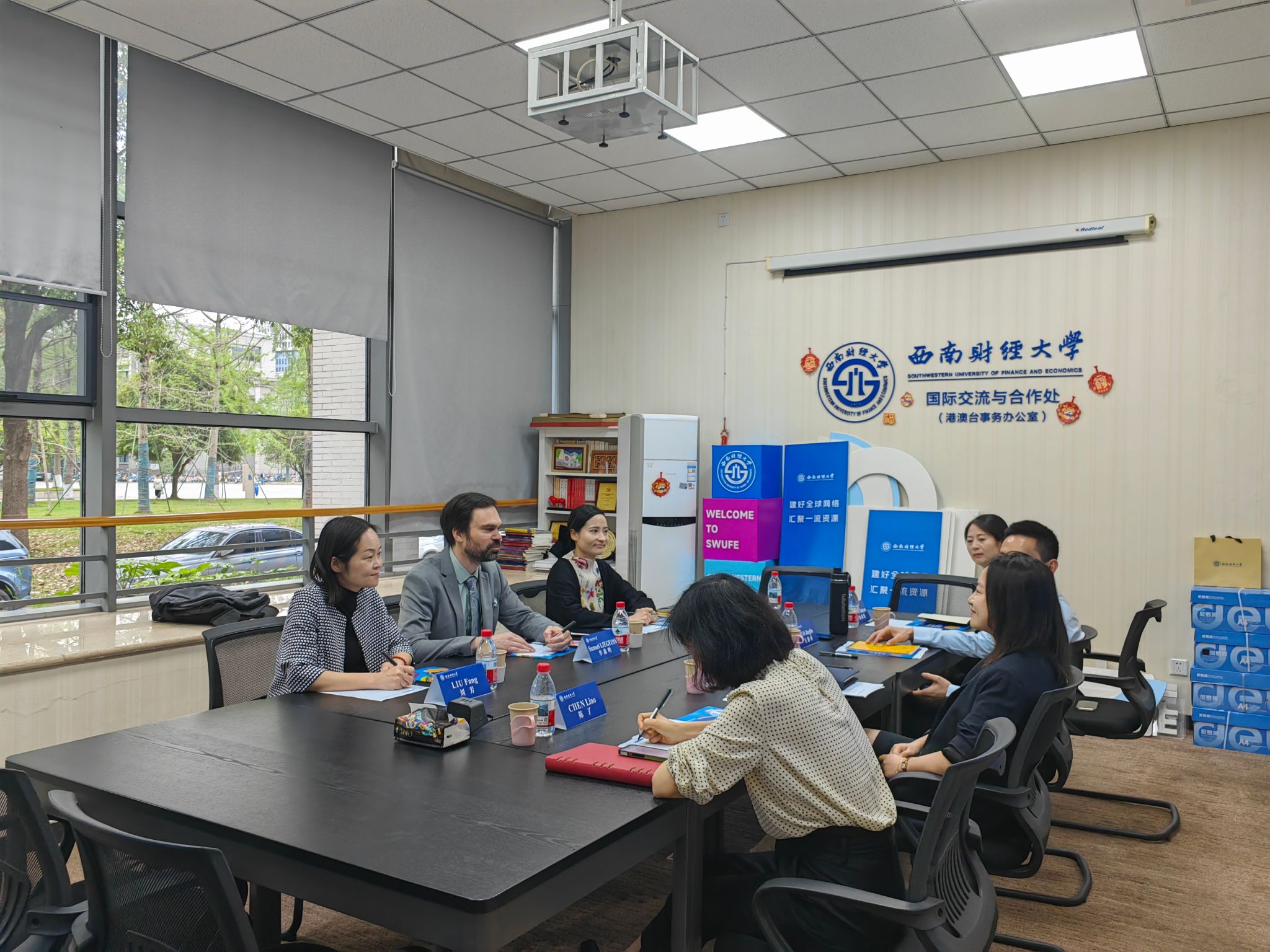 王偞婷对李森明一行表示欢迎并简要介绍了学校情况和我校中法教育交流情况。她表示,西南财经大学与法国高等教育机构合作基础深厚,近年来在合作办学、联合科研、师生交流等方面取得积极进展。期望在法国驻成都总领事馆的支持下,进一步落实中法教育合作共识,拓展与更多一流法国院校的联系,积极推动中法合作办学项目或机构建设,实现优势互补、互利共赢。